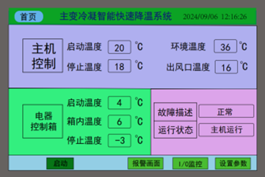 根据环境温度或定制时间来控制系统的启动: 当环境温度高于32℃(可设定)时启动系统降温, 当环境温度低于30℃(可设定)时停止运行。